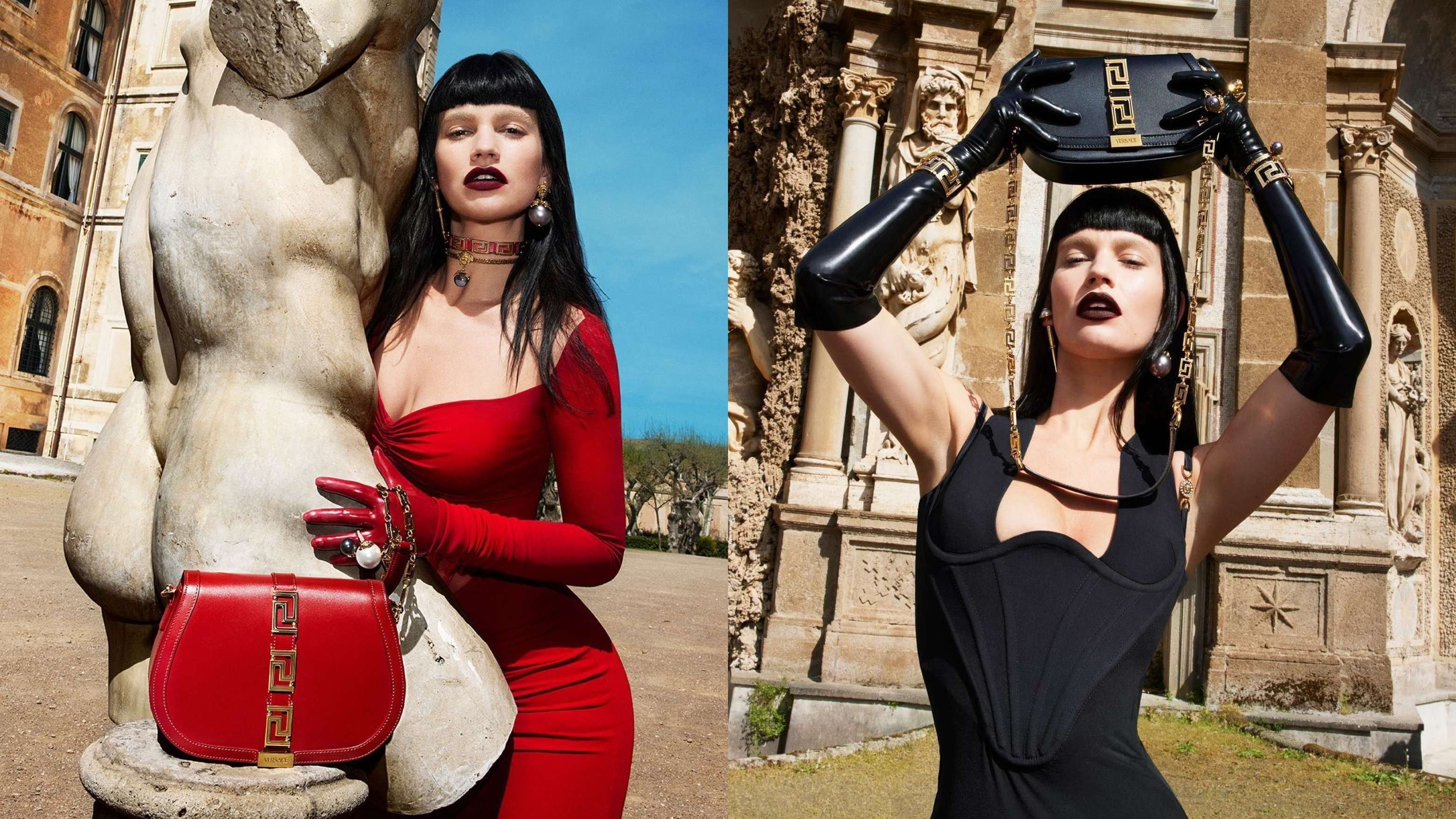 Në fushatën e re të shtëpisë së modës për vjeshtën 2022, duke theksuar çantat e saj Greca Goddess, bukuroshja britanike mban një parukë të zezë, vetulla të zbardhura dhe lëkurë të zezë.