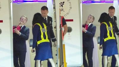 Në momentin kur dera e aeroplanit u hap, dora e Brigitte ‘godet’ fytyrën e presidentit francez.
