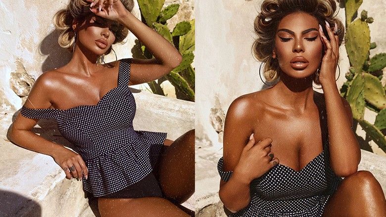 Ajo ka pozuar me bikini një pjesësh, me një bluzë të zezë me pika të bardha, duke marrë një pamje mjaft joshëse.