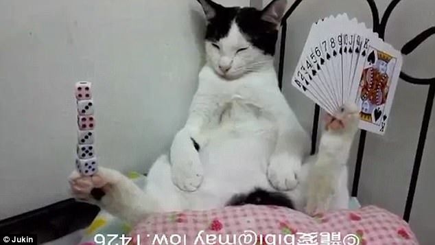 Në Kinë është filmuar një mace, të cilës i vendosin nëntë zare në putër dhe ajo i mbanë e qetë.
