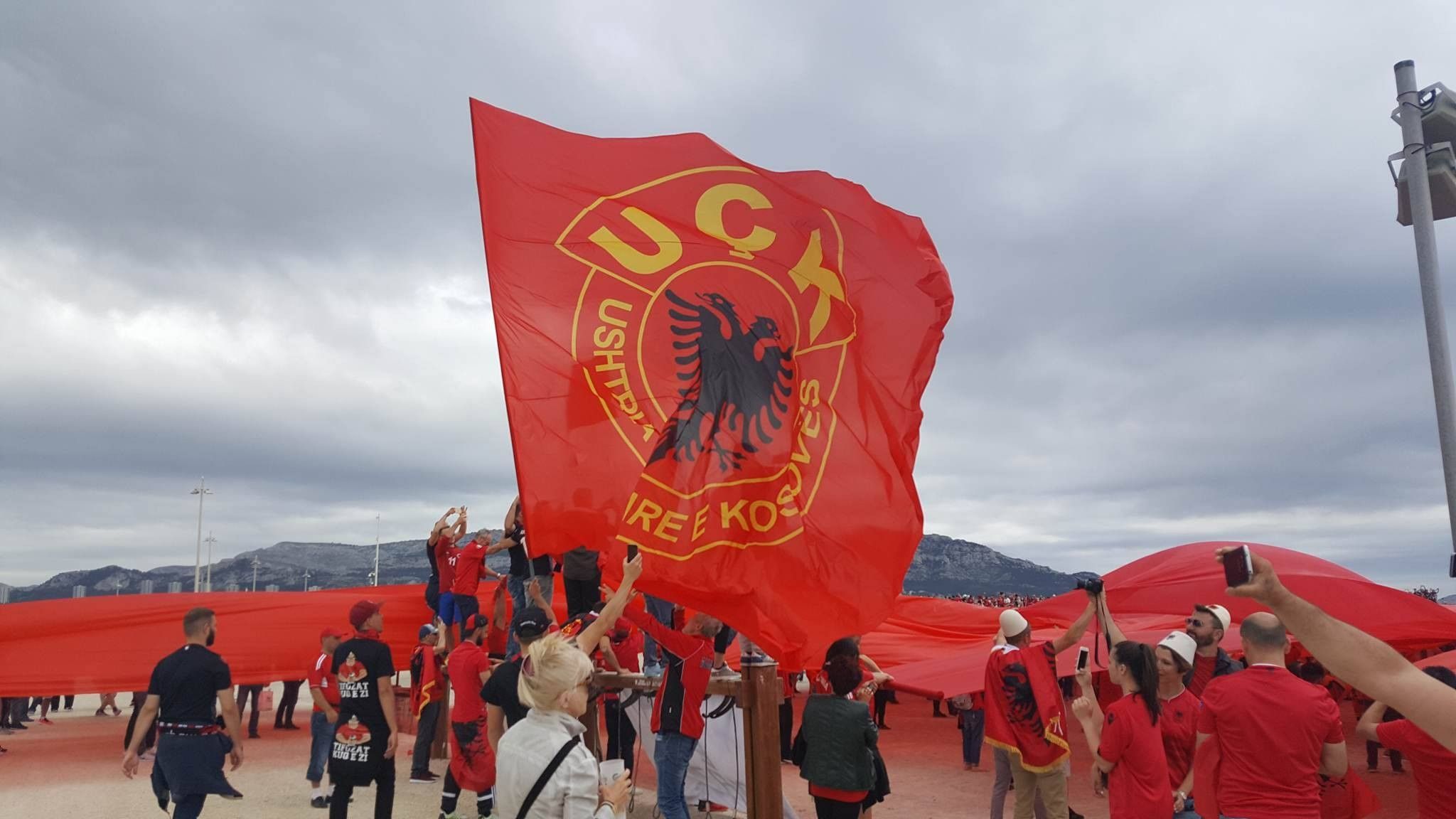 Ashtu siç është paralajmëruar, është shpalosur flamuri gjigant kombëtar nga tifozat Kuq e Zi në plazhin e Marseilles.