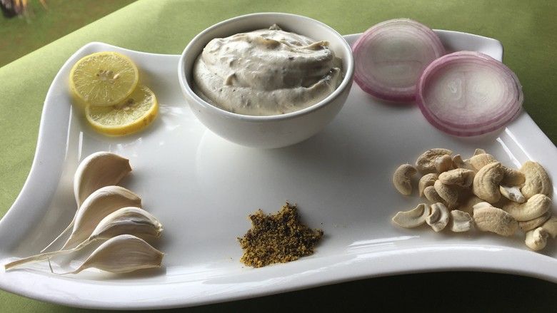 Përbërësit:- 2 lugë vaj ulliri,- 2/3 e filxhanit arra indiane,- 2/3 e filxhanit fara luledielli,- ¾ e lugës së vogël kripë,- ¾ e filxhanit ujë të ftohtë, uthull apo lëng limoni (sipas dëshirës),- 1 hurmë,- 2 thelpinj hudhre,- 1 lugë mustardë.