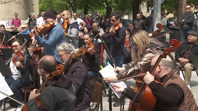 Me instrumentë në dorë dhe muzikë, punonjësit e Filharmonisë së Maqedonisë protestuan para Ministrisë së Kulturës për të shprehur pakënaqësinë e vendimit qeveritar që në objektin e tyre të vendoset jazz orkestri.