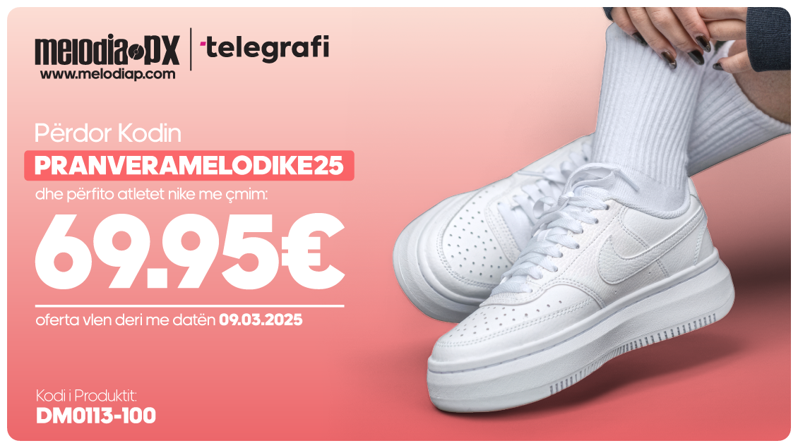 Nëse dëshironi të përditësoni garderobën tuaj për pranverë, atëherë kjo ofertë është ideale për ju! Melodia Px dhe Telegrafi kanë bashkuar forcat për t'ju sjellë një mundësi të jashtëzakonshme: atletet Nike për femra me një çmim që s'mund ta refuzoni. Me vetëm 69.95€, ju mund të bëni tuajat këto atlete ikonike, duke përdorur kodin Pranveramelodike25 në Telegrafi Deals.