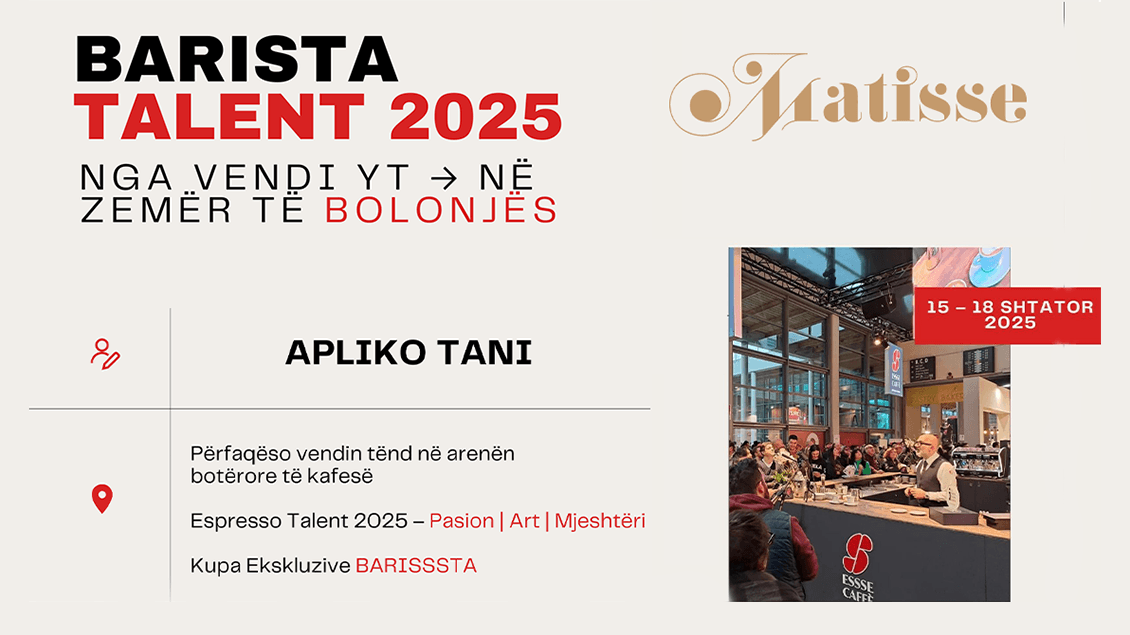 Përmes një iniciative unike, Matisse do të bëhet ura që lidh baristat e talentuar me skenën ndërkombëtare të kafesë në ngjarjen prestigjioze Barista Talent 2025, e cila do të mbahet në Bologna, Itali, nga 15 deri më 18 Shtator 2025.