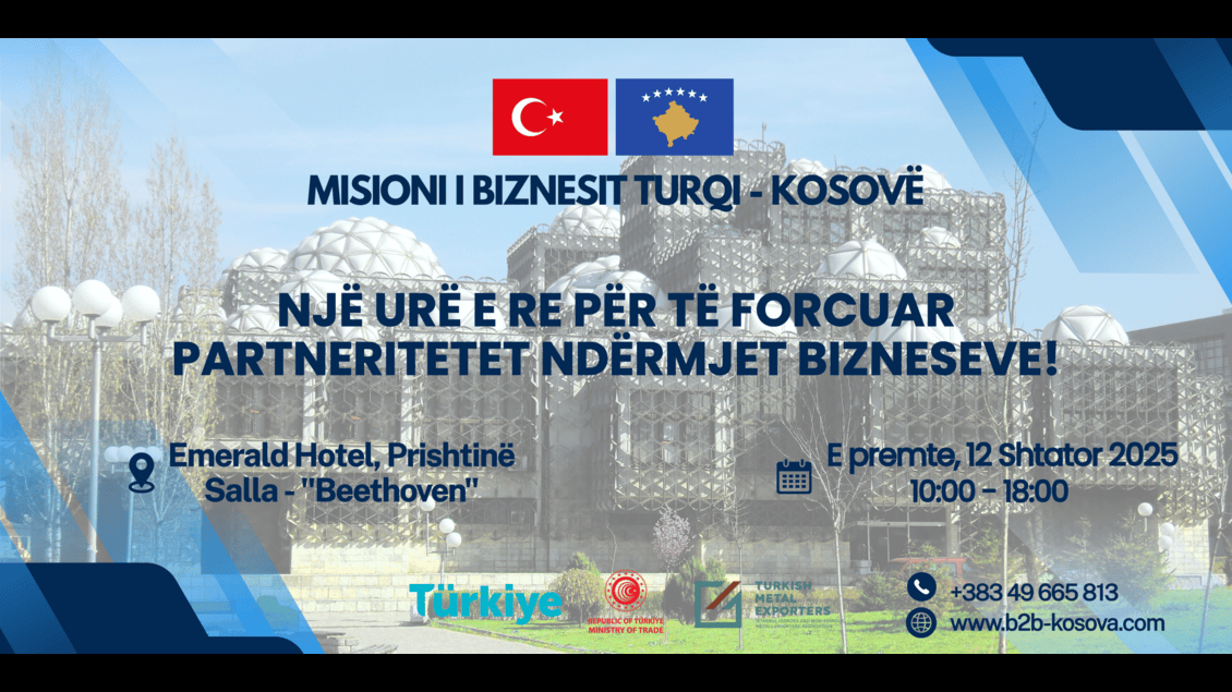 Prishtina do të bëhet qendra e biznesit rajonal, të premten, 12 shtator 2025, kur mbi 10 industri turke do të paraqiten në një mision tregtar unik, duke ofruar takime të drejtpërdrejta me kompanitë e Kosovës.