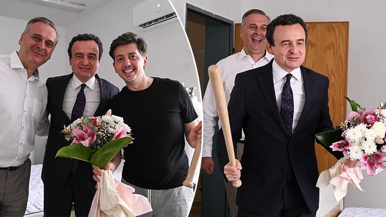 Në këtë vizitë, Kurti shoqërohej nga deputeti i Lëvizjes Vetëvendosje, Mefail Bajqinovci. Të dy sollën me vete dhurata simbolike për humoristin: një buqetë me lule për të uruar shërim të shpejtë dhe një ‘stupc’ – shkop bejsbolli – siç e quajtën në mënyrë metaforike dhe humoristike “për të larguar të ligat”.