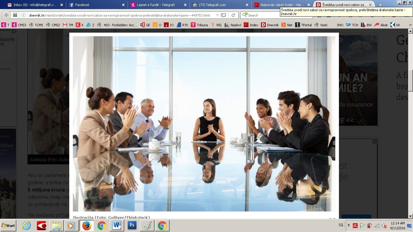 Kompanitë suedeze do të përballen me gjoba, nëse bordet e menaxhimit dhe pozicionet ekzekutive nuk përbëhen nga 40 për qind femrave. Ky është projektligji që pritet ta miratojë Suedia. E, nëse Parlamenti pajtohet me këtë, ai hyn në fuqi vitin e ardhshëm, ndërsa më 2019 kompanitë do të dënohen me gjobat nga 50 mijë e deri në 525 mijë euro nëse nuk e plotësojnë këtë kusht. Rregullat e reja do të vlejnë për 280 kompani të mëdha dhe 50 kompani shtetërore.
