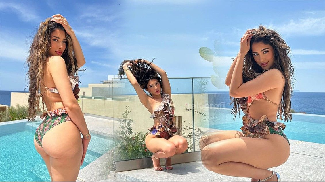 E veshur me rrobabanje me motive boho dhe prerje të theksuara anësore, këngëtarja duket mahnitëse teksa pozohet në një sfond përrallor, me detin dhe pishinën që ndërthuren në mënyrë perfekte me bukurinë e saj natyrale.