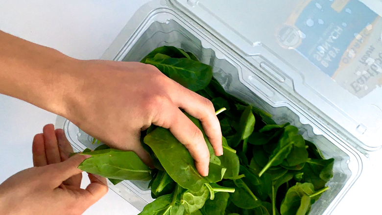 Mbështillni fletët e lara e të thata të spinaqit në folie transparente dhe vendoseni në frigorifer.