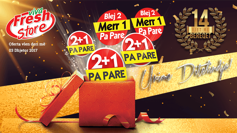 Gjithashtu me rastin e ditëlindjes së 14-të në Viva Fresh Store, mund të përfitoni ÇDO TË TRETIN PRODUKT FALAS në kuadër të ofertës BLEJ 2 PRODUKTE MERR 1 FALAS, në të gjitha produktet e sektorit të veshmbathjeve dhe produkteve shtëpiake.