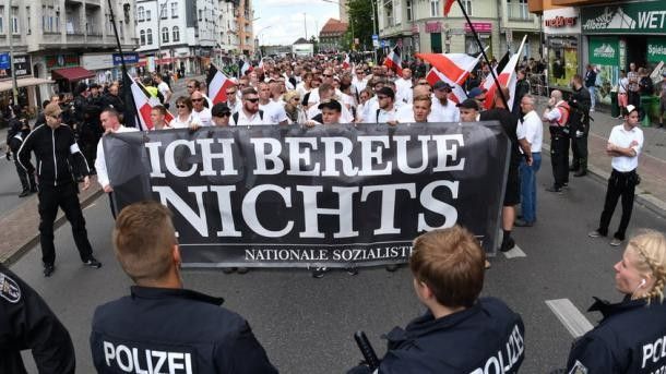 Balona, ku ishin shkruar "Jo vend për nazistët", fluturuan mbi kokat e protestuesve, mes të cilëve ndodhej edhe një grup i vogël të moshuarash, të cilat mbanin pankarta ku shkruhej "Gjyshet kundër të djathtës" apo "Spandau pa nazistë", përcjell Telegrafi.