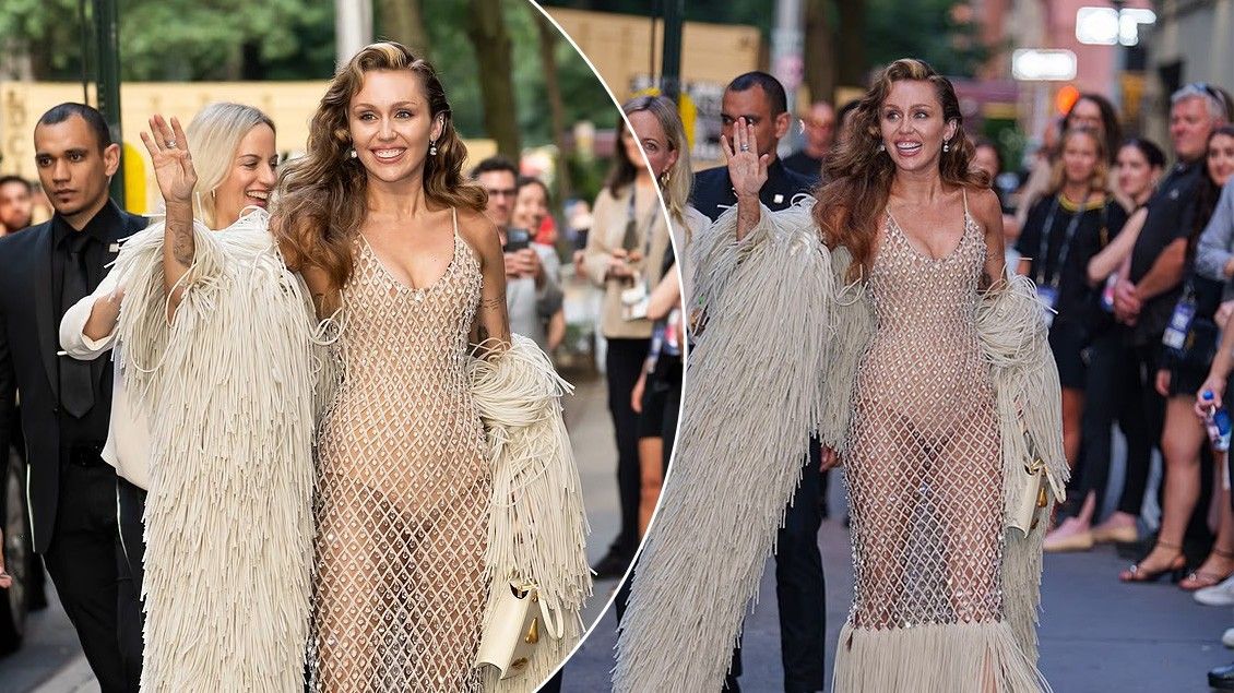 Miley Cyrus magjeps me një fustan rrjete në premierën e albumit në New York
