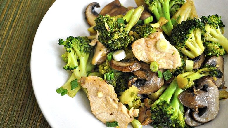Një recetë e shijshme dhe e ushqyeshme. Përbërësit:- 500 g gjoks pule, - 250 g kërpudha shampinion, - 500 g brokoli, - 1 filxhan supë pule, - 1/3 filxhan salcë soje, - ¼ filxhan miell, - 3 thelpinj hudhre, - 1 lugë e vogël xhenxhefil, - 2 lugë të vogla vaj susami, - 1 lugë e vogël sheqer ngjyrë të kaftë, - Kripë, - Piper.