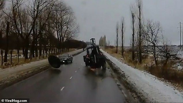 Pak më vonë, një makinë vjen nga drejtimi i kundërt derisa rrota traktorit “shkëputet” nga boshti.