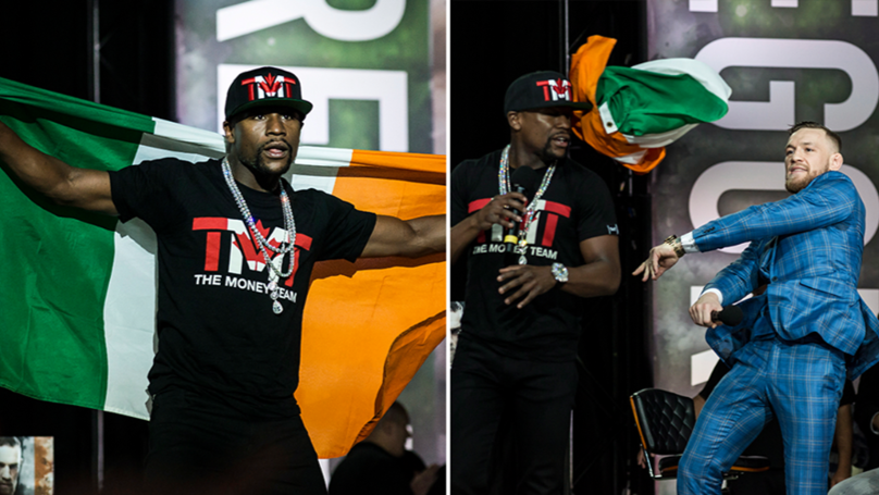 Gjatë një momenti të këtij prezantimi para të pranishmëve, ishte McGregor ai që hodhi flamurin irlandez në fytyrë të Mayëeather, i cili më pas tentoi të ç’tendosë situatën duke mbajtur flamurin irlandez në krah.