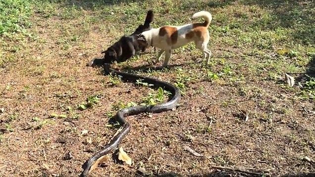Në video, shkruan mapo.al, shohim se si 4 qentë, përballen me gjarprin e llojit kobra, (helmi i të cilit është vdekjeprurës nëse nuk trajtohet menjëherë me anti-helm) duke e kafshuar atë me dhëmbë.