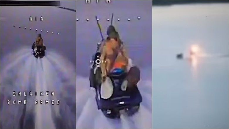 Dhe kur droni përplaset në pjesën e pasme të "jet ski", ai shpërthen në një top zjarri – duke u fundosur.