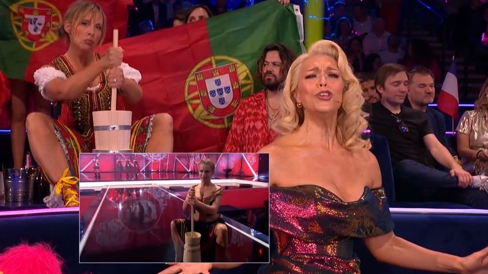 Momenti më bizar i Eurovisionit u vu në skenë nga komikja Melanie Giedroyc, prezantuesi nuk mund ta mbante të qeshurën