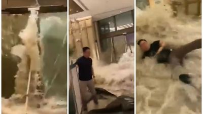 Në pamjet e shpërndara në Facebook, një valë e madhe uji shkatërroi në mënyrë dramatike dyert prej xhami të hotel Fullerton Ocean Park në Aberdeen, Hong Kong, duke përmbytur menjëherë hollin.