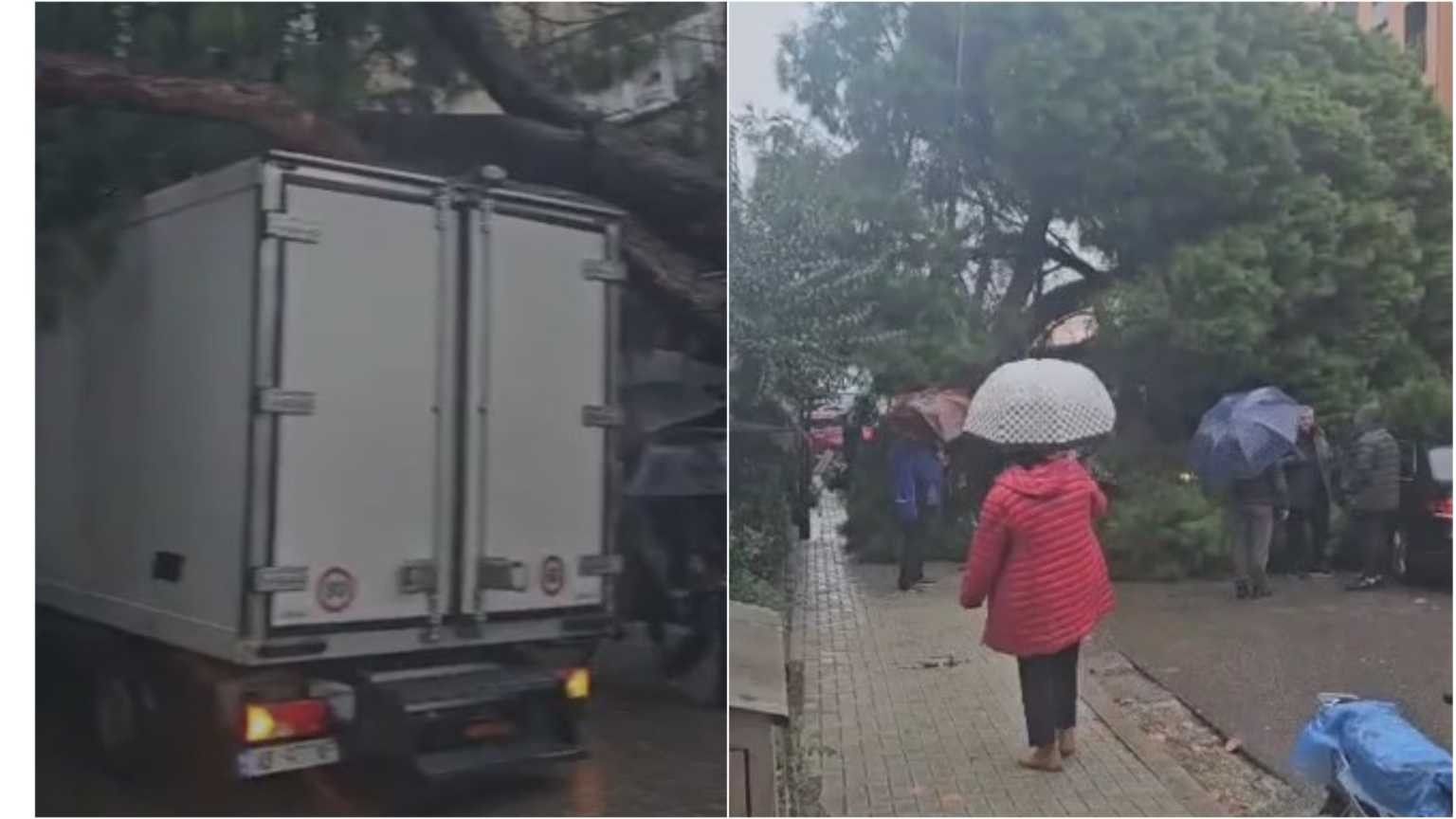 Moti i keq, rrëzohet dhe bie mbi një automjet pema në Tiranë
