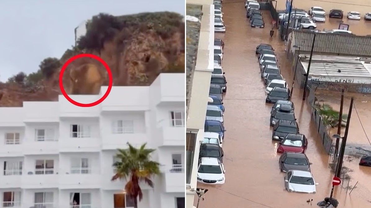 Ky është momenti kur copëza shkëmbi masivë bien mbi një hotel në Ibiza para turistëve britanikë që bërtasin, duke lënë tre persona të lënduar dhe të tjerë të bllokuar ndërsa një kodër u shemb gjatë shiut të dendur.