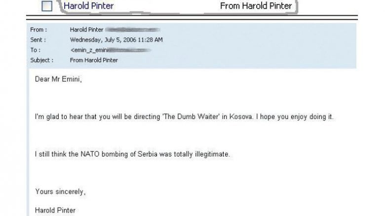 Dhe, çudia ndodhi. Pas 5 ditësh, në e-mailin tim kishte edhe një letër. Vinte nga Londra. Nga nobelisti Harold Pinter. Një e-mail që kishte gjithsej katër fjali. Fjalia e parë ishte përshëndetja e tij me shumë respekt dhe nderim që më kishte bërë.