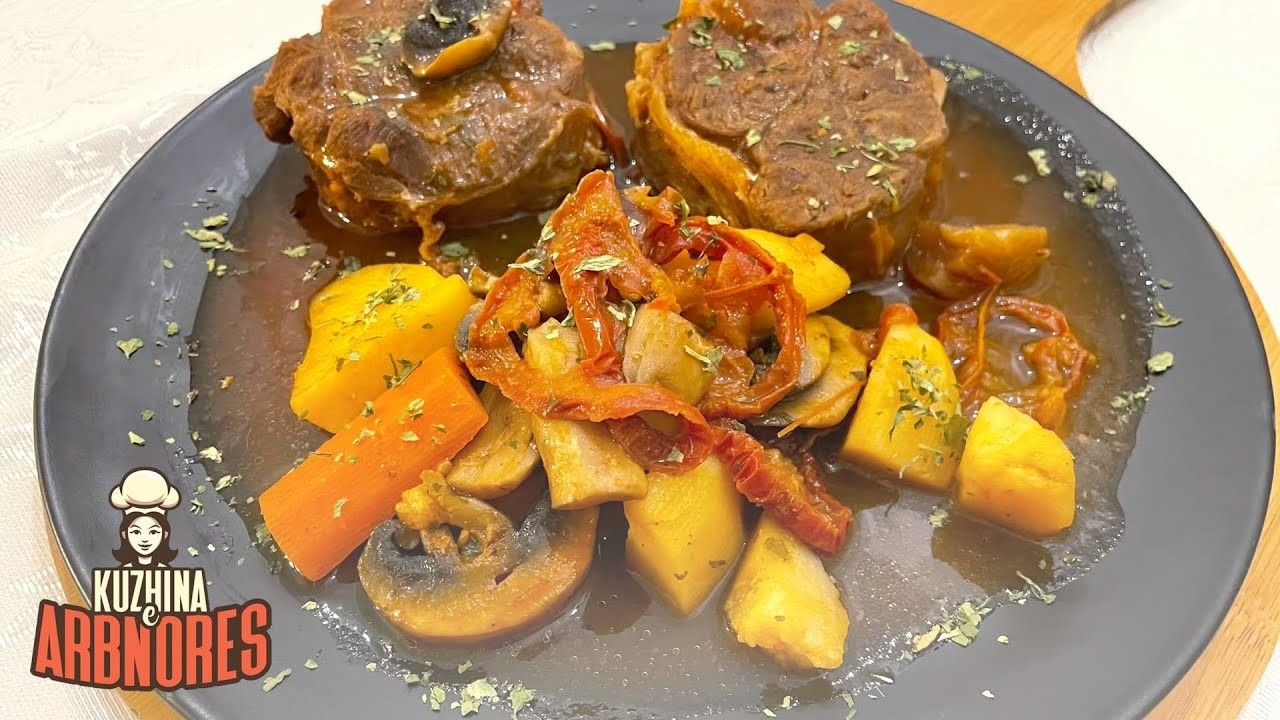 Përbërësit:▪ 1 kg muskuj viçi▪ kripë, piper të zi, piper të kuq dhe erëza▪ 350gr kërpudha të freskëta▪ 4-5 patate mesatare▪ dy karota▪ një qepë e kuqePër salcën:▪ dy lugë gjelle pure domatesh▪ një kube koncentrat viçi▪ majdanoz i freskët.Përgatitja e plotë me video:
