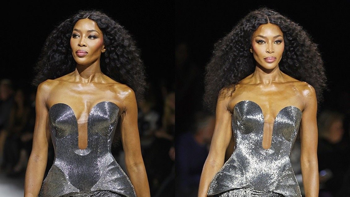Naomi Campbell shkëlqen në pistën e modës me një bluzë argjendi dhe një fund të tejdukshëm gjatë Javës së Modës në Paris