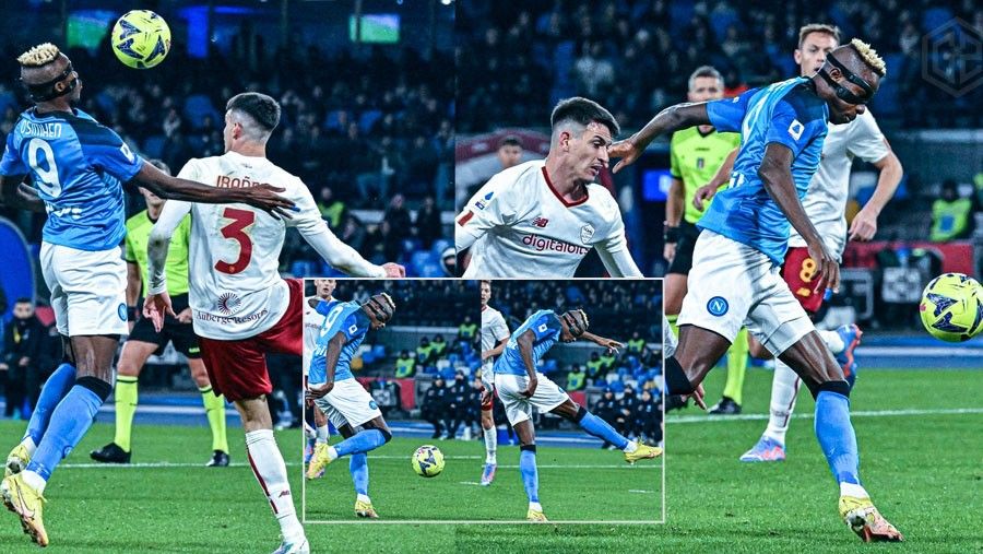 Khvicha Kvaratskhelia dërgoi një harkim në zonë, të cilin e ndali me gjoks Victor Osimhen, edhe pse pranë i kishte dy lojtarë kundërshtarë.