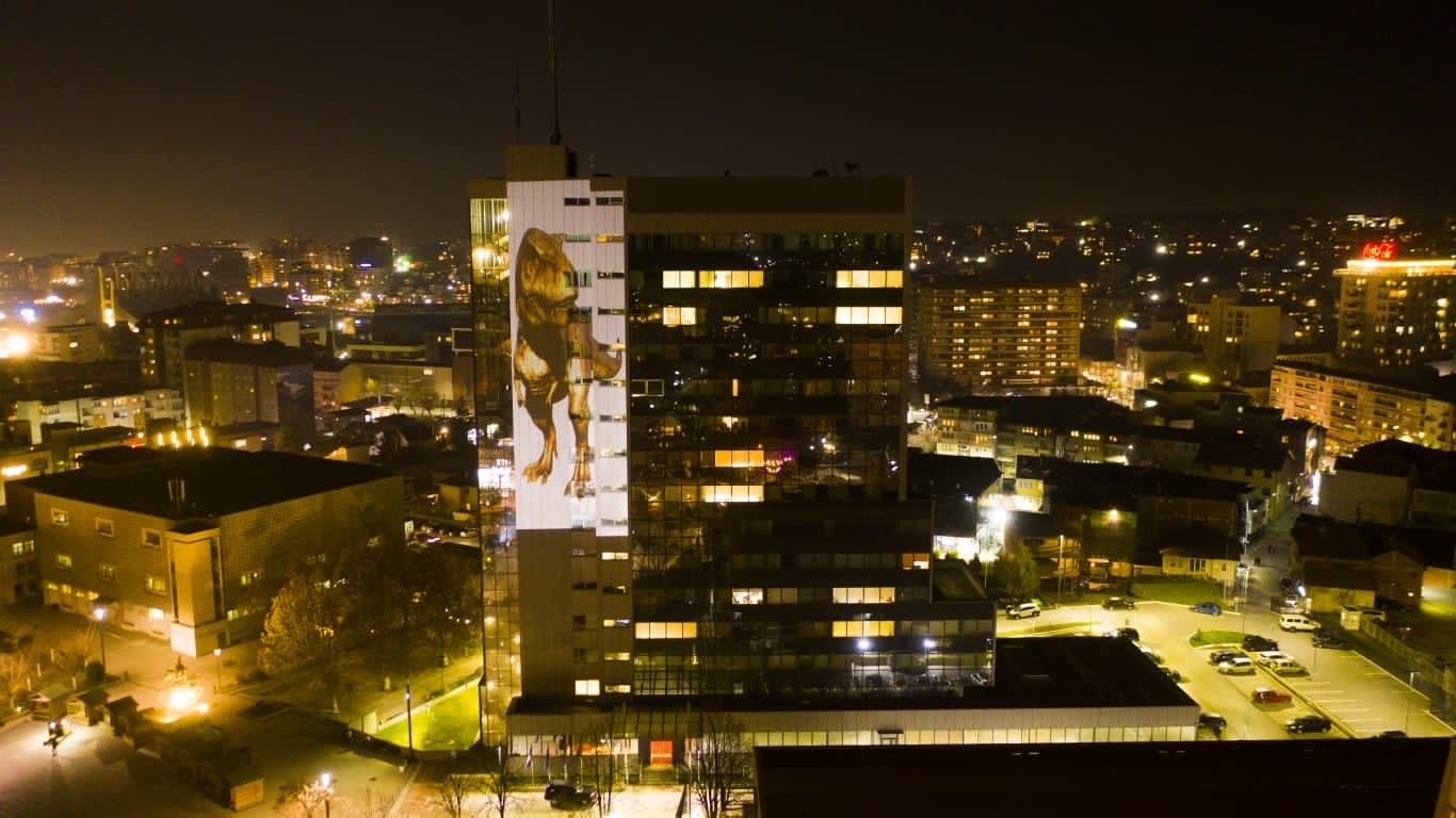 Në prani të Nicholas Abbott, ambasador i Mbretërisë së Bashkuar në Kosovë, Karin Hernmarck, ambasadore e Suedisë në Kosovë, Lulzim Baumann, Këshilltar i jashtëm për çështje mjedisore në Ministrinë e Mjedisit, Planifikimit Hapësinor dhe Infrastrukturës, Ulrika Richardson, Koordinatore e OKB-së për Zhvillim, znj. Maria Suokko, Përfaqësuese e Përhershme e UNDP-së dhe pjesëmarrës të tjerë, ndërtesa u ndriçua me figurën e Dinos për të rritur ndërgjegjësimin e publikut për urgjencën për t'u larguar nga përdorimi i lëndëve djegëse fosile dhe kalimin në energji më të pastër.