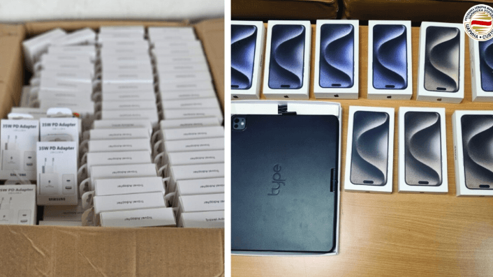 “Në Aeroportin Ndërkombëtar të Shkupit, 883 kufje (dëgjuese) me bluetooth dhe 1.048 maska të për celularë me logon “Apple” janë ndaluar përkohësisht në doganë, të deklaruara për import, për të cilat aktualisht ka filluar procedura për shkelje të të drejtave të pronës intelektuale. Ashtu si në rastin e parë, bëhet fjalë për një dërgesë nga Dubai, për të cilën është dorëzuar një deklaratë doganore importi për kufje të zakonshme bluetooth dhe maska për celularë. Çmimi i parashikuar me pakicë për këto produkte nëse shiten si origjinale është 220 mijë euro”, thonë nga Doganat.