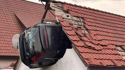 Makina me sa duket u nis, fluturoi në ajër – dhe u përplas në murin e jashtëm të një hambari ngjitur në lartësinë e katit të parë.