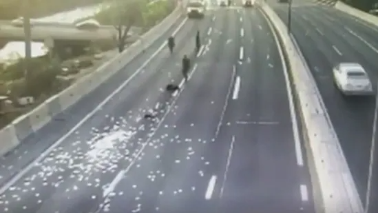 Disa kalimtarë me fat arritën të kapnin disa kartëmonedha në kohën kur policia ndaloi trafikun për të mbledhur paratë e shtrira në rrugë.