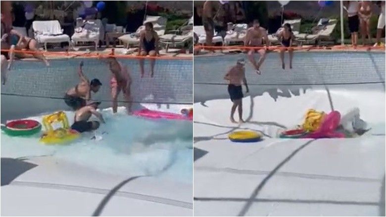 Kjo pasi që “dyshemeja” e pishinës u shemb dhe shatërvani i ujit “mori me vete” dy burra.