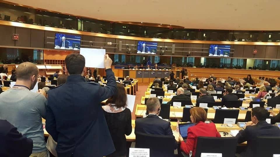 Brenda sallës së Parlamentit Evropain janë shpalosur afishe me kërkesë për liberalizimin e vizave