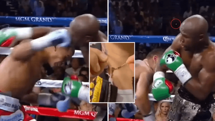 Në xhirim të ngadalësuar, dhëmbi i Mayweather 'fluturon' nga goditja e fortë - kundërshtari i tij ka bërë veprim të pazakontë me të