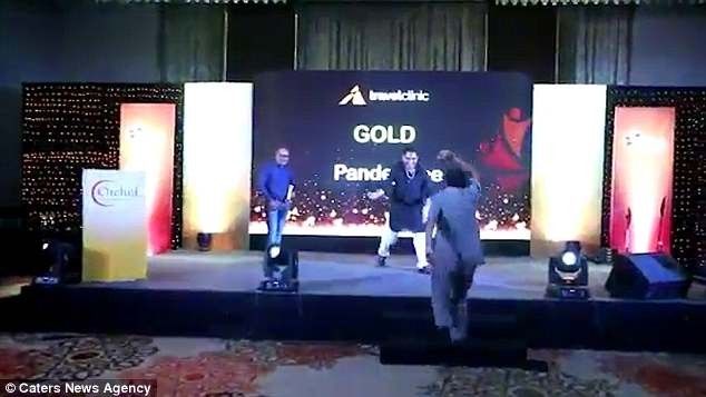 Por, disa sekonda më vonë biznesmeni nga Mumbai humb drejtpeshimin dhe rrëzohet në skenë, duke i lënë të shokuar të pranishmit në sallë.