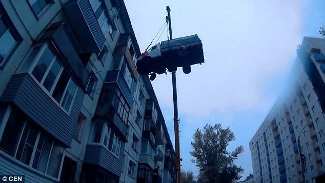 Ngriti kamionin në katin e pestë të ndërtesës me vinç gjigant, për ta befasuar të dashurën për ditëlindje (Foto/Video)