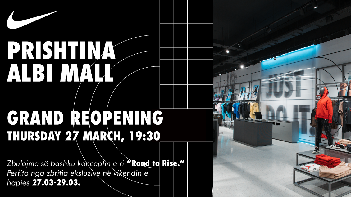 Nike, marka ikonë botërore, po rihap dyqanin e saj të rinovuar dhe të zgjeruar nëAlbi Mall, të enjten, më 27 mars 2025, në orën 19:30. Kjo rihapje madhështore do të prezantojë konceptin më të ri të Nike-s, "Road to Rise", duke ofruar një përvojë të re dhe inovative për të gjithë vizitorët.