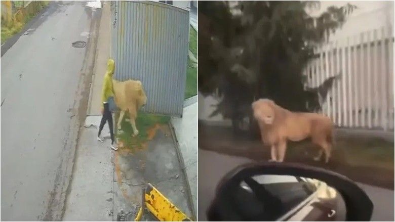 Një burrë "i guximshëm" ecën pranë një luani të arratisur nga kopshti zoologjik dhe endet nëpër një qytet të Meksikës