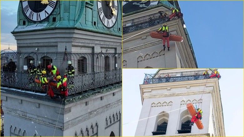 Shërbimet e emergjencës në Mynih shpëtuan një grua të lënduar nga kulla e kishës në një operacion dramatik zbritjeje nga lartësia, tha të hënën brigada e zjarrfikësve të qytetit jugor gjerman.