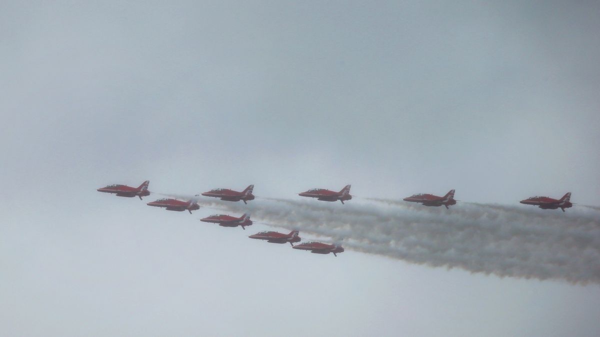 Fotot e shkëlqyera shfaqin aeroplanët "Red Arrows" duke fluturuar drejt qendrës "Mall" në Londër, por pak sipër tyre rrinte pezull një objekt i kuq.