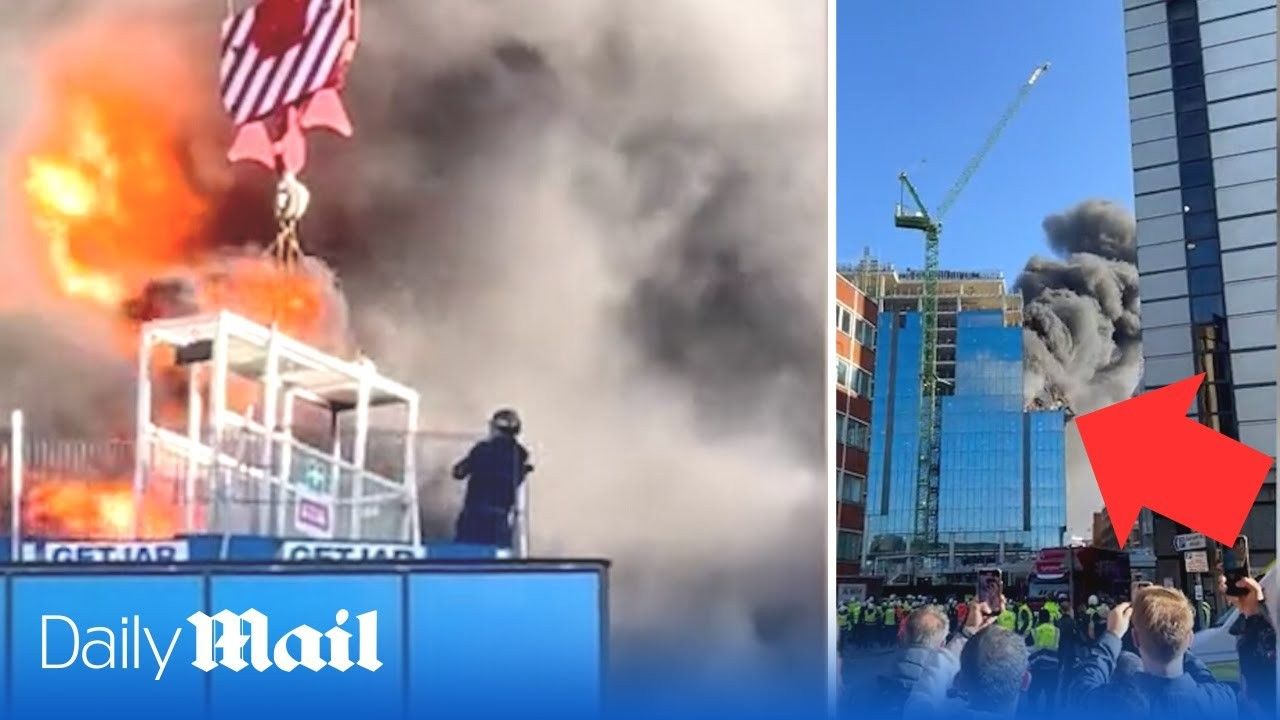 Një punëtor u bllokua në çati pranë një rrokaqiell të djegur në Reading, Angli.