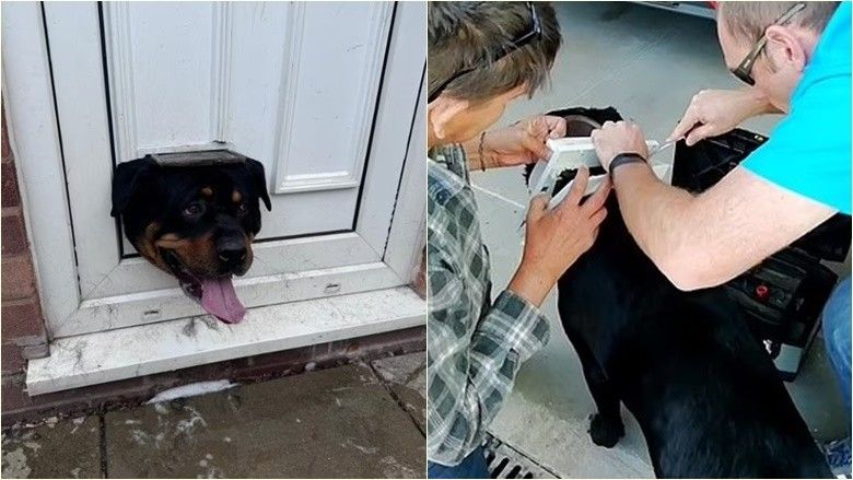 Një qen në Angli siç duket nuk i bëri matjet mirë – përfundoi i mbërthyer në një derë