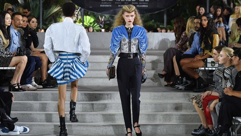Pantallonat e shkurtra e të gjera me shtratin e lartë, pantallonat e gjata të ngushta te kyçet, bluzat- korse prej kadifeje dhe xhaketat e zeza me argjend duket se janë tendencat kryesore që propozon drejtori artistik i Louis Vuitton, Nicolas Ghesquiere në këtë sfilatë ndryshe nga të tjerat.
