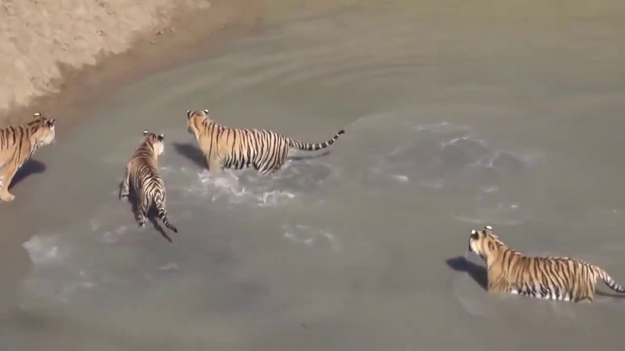 Në një hapësirë të vogël të mbushur me ujë shihen katër tigra siberianë që tentojnë të kapin një shotë të vogël që po lahej aty.