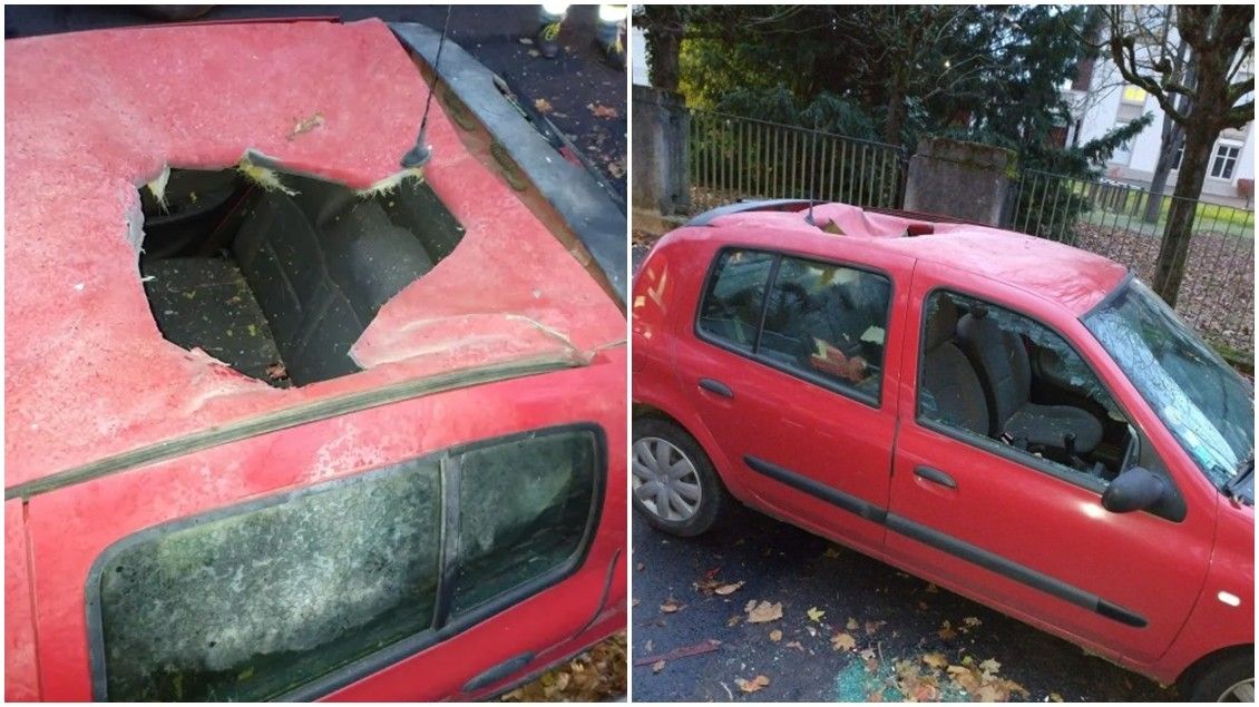 Me të mbërritur ata vërejtën një vrimë 50 centimetra të gjerë në çatinë e një makine derisa një dritare ishte thyer.