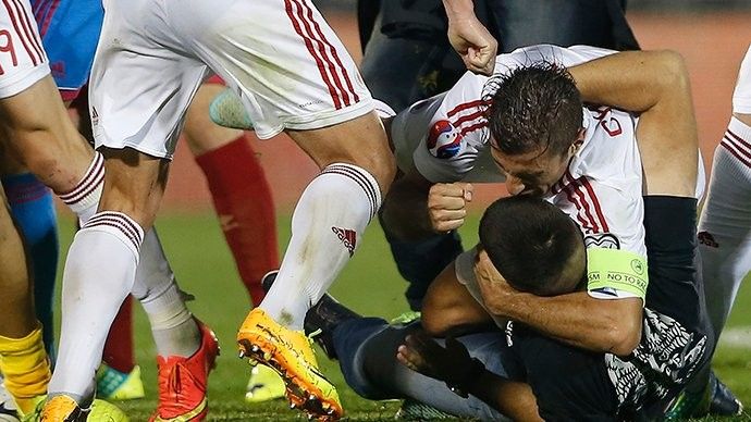 Të irrituar shumë tifozë çetnik serb hynë në fushë duke sulmuar fizikisht të gjithë lojtarët tanë, gjë që detyroi Taulant Xhakën e Mërgim Mavrajn t’i grushtojnë një nga një, kurse Lorik Cana shtreu për toke duke grushtuar në mënyrë heroike terroristët që hynë në fushë.