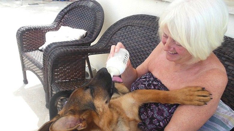 Një qen i ri gjerman duket se nuk e ka kuptuar se është qen, pasi që ai pi qumësht nga shishja e bebeve, fle në karrocë fëmijësh dhe madje mban në gojë edhe biberon.